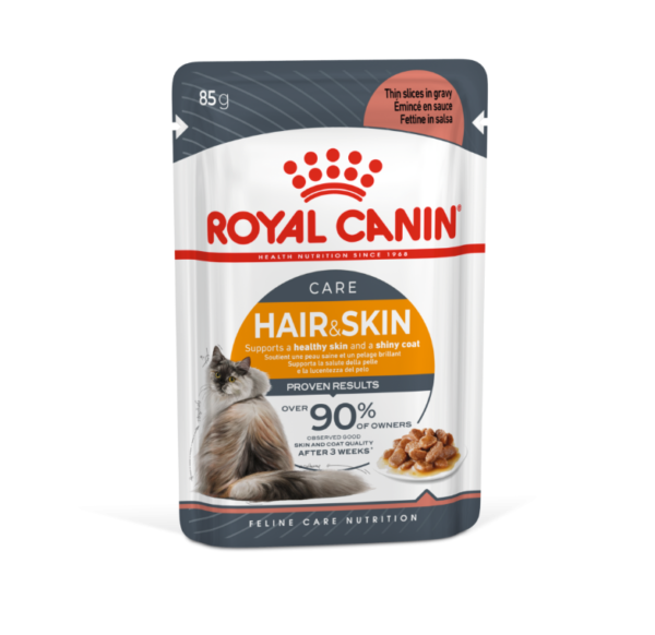 ROYAL CANIN® Hair & Skin Care in Gravy is a nutritionally complete and balanced formula specially designed to support your cat’s skin and coat health. This formula contains omega-3 fatty acids – including EPA and DHA – and omega-6 fatty acids to help support and nourish your cat’s skin and coat from the inside out. ROYAL CANIN® Hair & Skin Care has proven results. Our study* showed that over 90% of owners observed good skin and coat quality after just 3 weeks of being fed with the Hair & Skin Care nutritional programme (combining both the dry kibble and wet food formulas). ROYAL CANIN® Hair & Skin Care is also available in jelly or loaf or as a dry kibble diet. A mixture of both wet food and dry food provides the variety cats love. *Royal Canin internal study